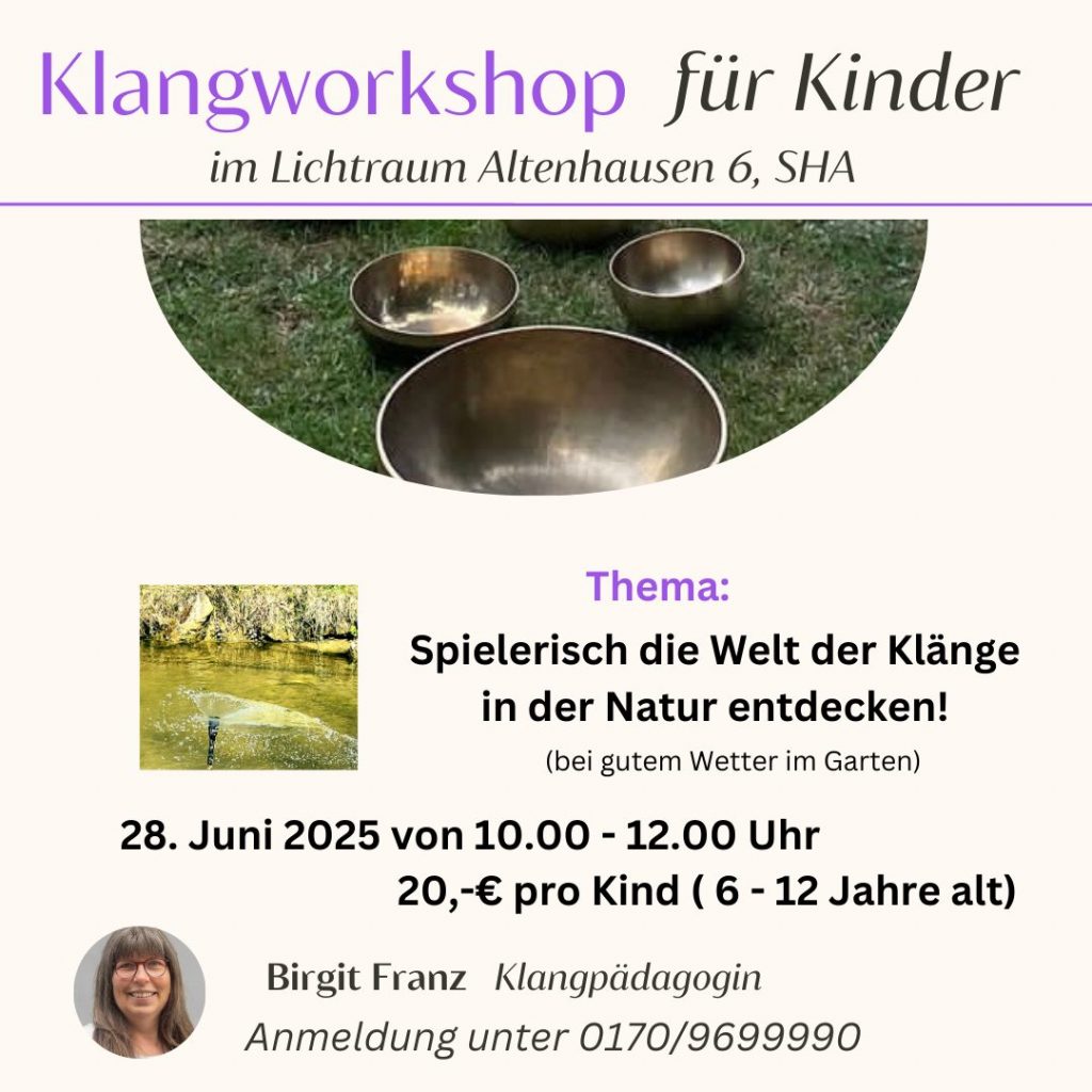 Die Kinder experimentieren mit den Klängen der Klangschalen, schulen die Sinne „Hören und Fühlen“ und erleben Entspannung in der Fantasie- und Klangreise. Achtsamer Umgang mit den Klangschalen, dem Anderen und mit sich selbst wird ebenso gefördert.