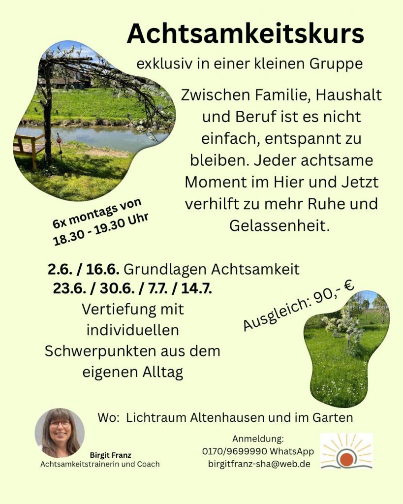 Zwischen Familie, Haushalt und Beruf ist es nicht einfach, entspannt zu bleiben. Jeder achtsame Moment im Hier und Jetzt verhilft zu mehr Ruhe und Gelassenheit. In diesem Kurs lenken wir den Blick darauf, wie du mit bewusstem Innehalten oder einer kurzen Meditation einen Schritt in Richtung eigener Mitte gehen kannst. Mit kleinen Übungen für Körper und Geist, die sich einfach in den Alltag einbauen lassen, lernst du in deiner Mitte zu bleiben.