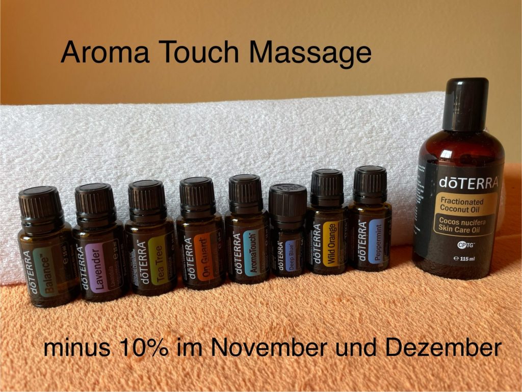 Bei der Aroma Touch Massage werden ätherische Öle von doTERRA verwendet. Es handelt sich hierbei um keine Massage im herkömmlichen Sinn, sondern die Öle werden mit streichenden Bewegungen ohne Druck auf den Körper aufgetragen. Dadurch kommt es zu einer Entspannung im Körper und die Selbstheilungskräfte werden aktiviert.
